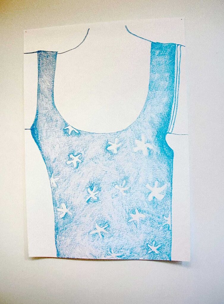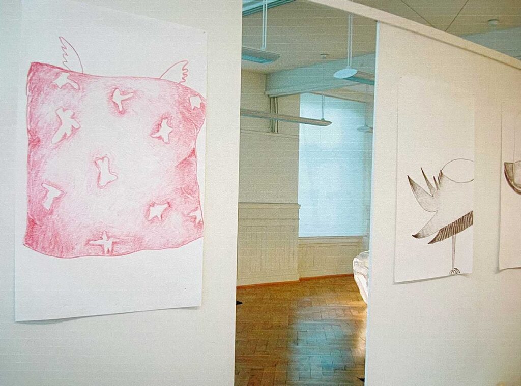 Die grossformatigen Zeichnungen als Teil der Ausstellung sind Vergrösserungen von Farbstiftzeichnungen in einem A5-Skizzenbuch, welche während eines Studienaufenthaltes in Berlin entstanden sind. Die Vergrösserung zeigt intensiv den Duktus der Zeichnung, den Rhythmus und die Bewegung und verstärkt die Unmittelbarkeit des Mediums.