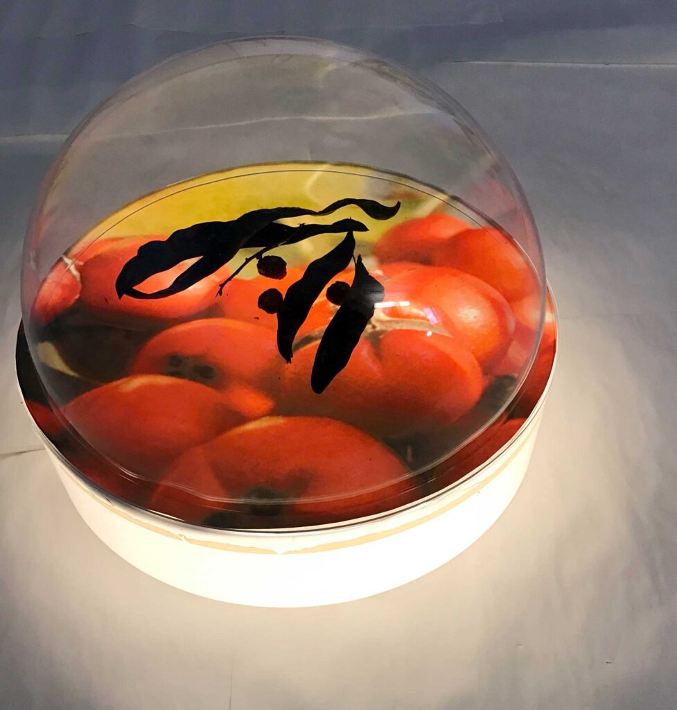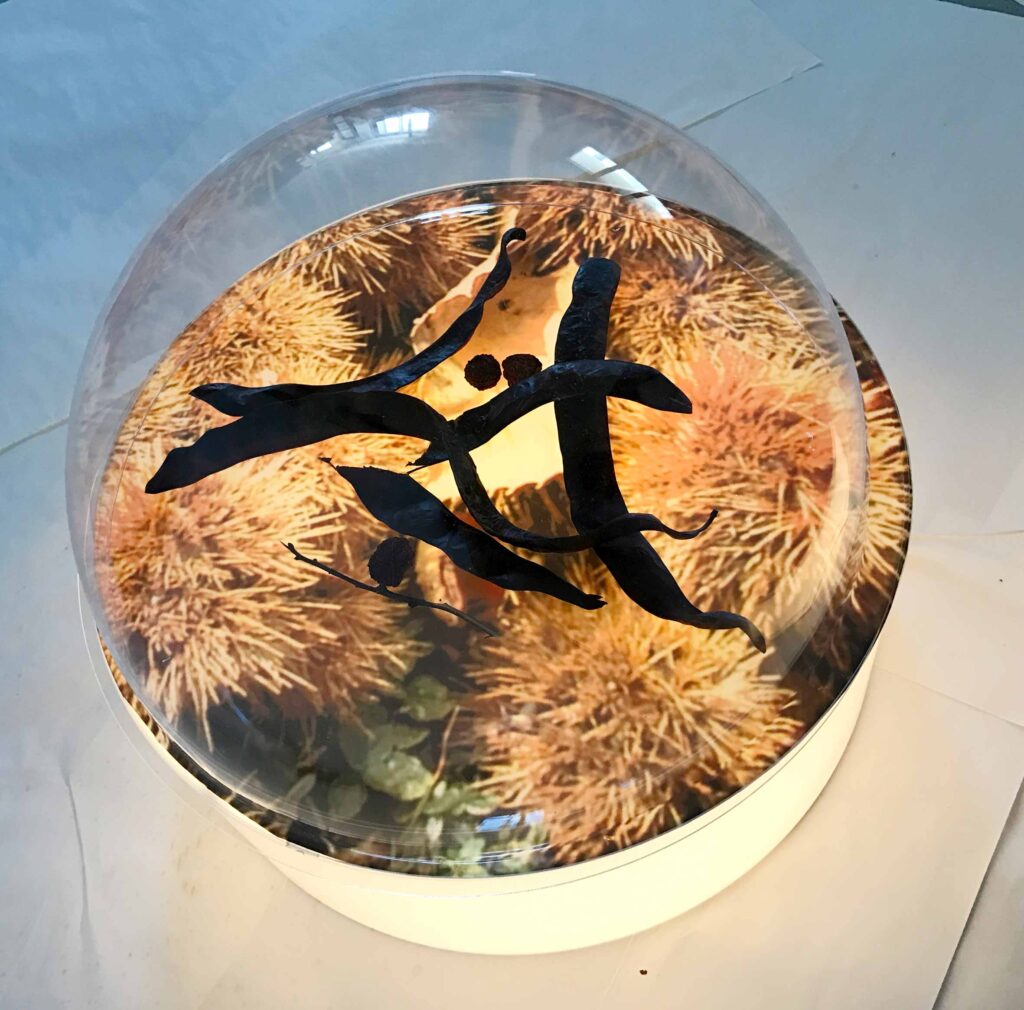 Die Plexi-Hauben haben einen Durchmesser von 60 cm. Fotografien von Früchten und Kastanien zusammen mit echten Fruchtkörpern zeigen die Endlichkeit des Paradieses indem die Früchte im Laufe der Ausstellung verderben und ungeniessbar werden.