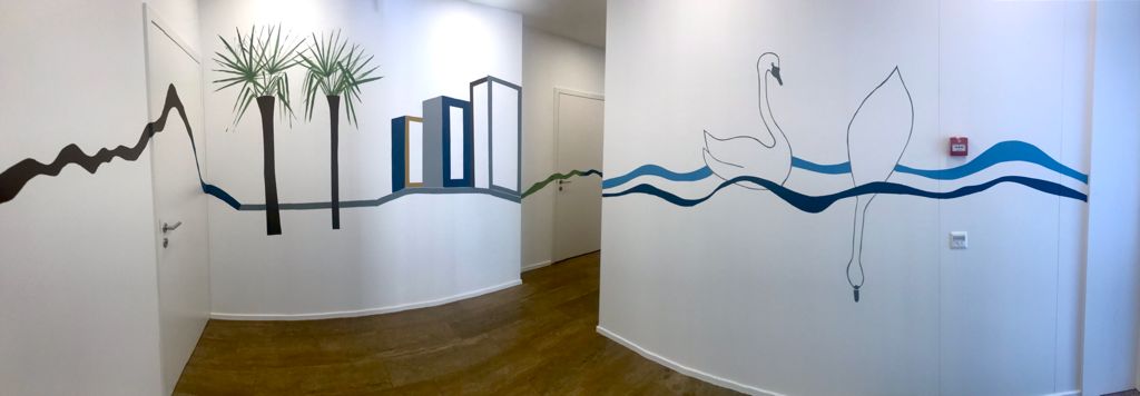 Die Linie zeigt die das umgebende Panorama: Denti della Vecchia, Monte Bre, San Salvatore, See zusammen mit spielerischen Elementen wie Palmen, die drei «Concordia-Türme», Wellen und Schwäne. Die minimalistische Malerei ist erfrischend und einladend.
