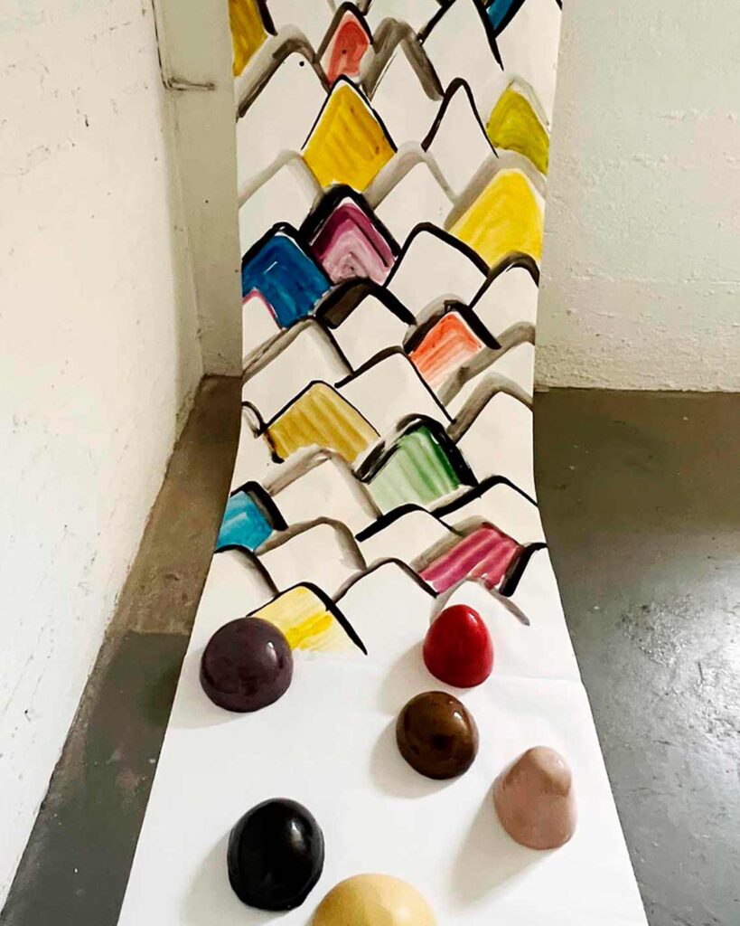 Installation aus Tuschzeichnung und verschiedenen farbigen Tonobjekten.
