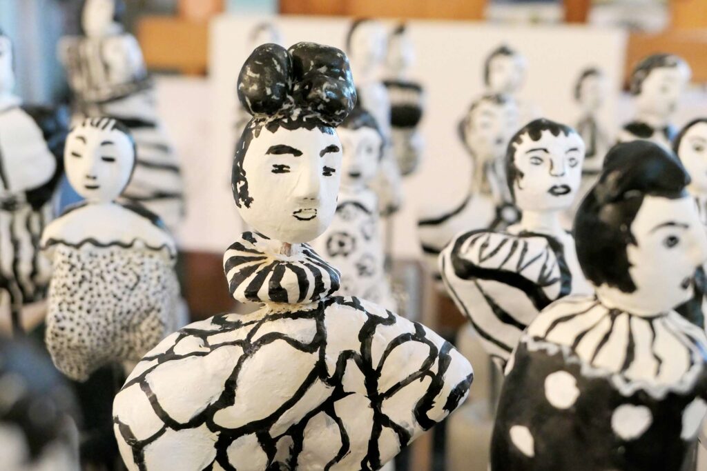 Tuschzeichnungen und Keramikreliefs in der Ausstellung Werkstatt Hildegard Schenk Sommer 2022.