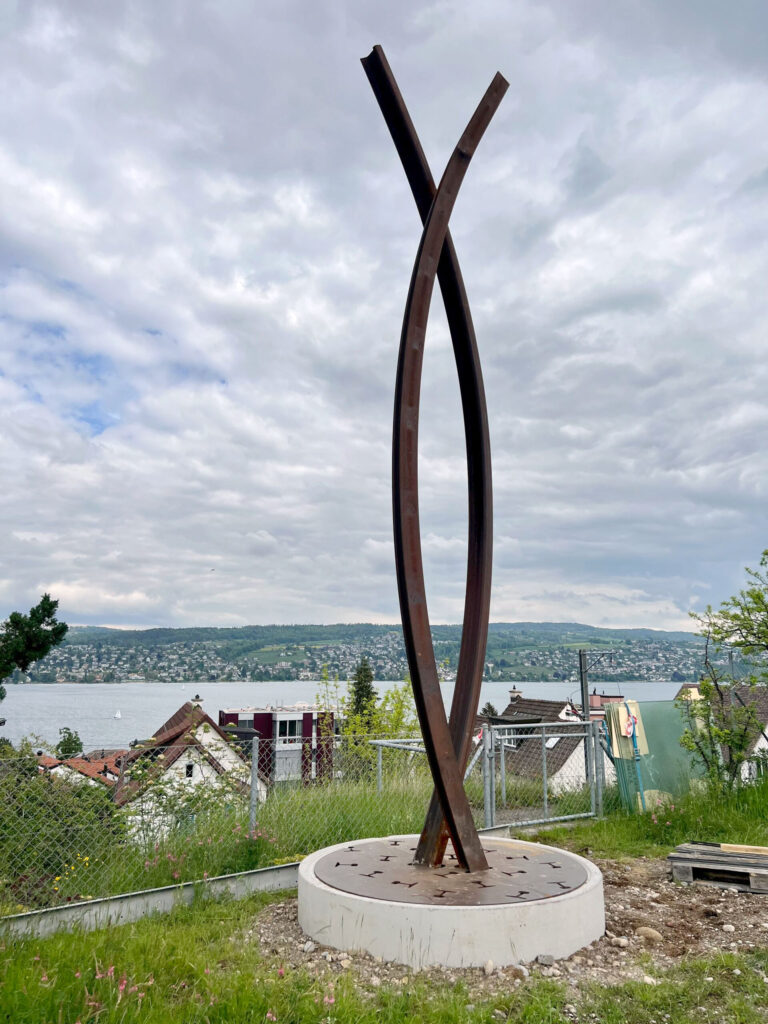Schienenskulptur «Doppelspur» in Thalwil – eine Arbeit der ThalwilerHofKunst im Auftrag der SBB für die Gemeinde Thalwil anlässlich der Tunneleröffnung 2022.