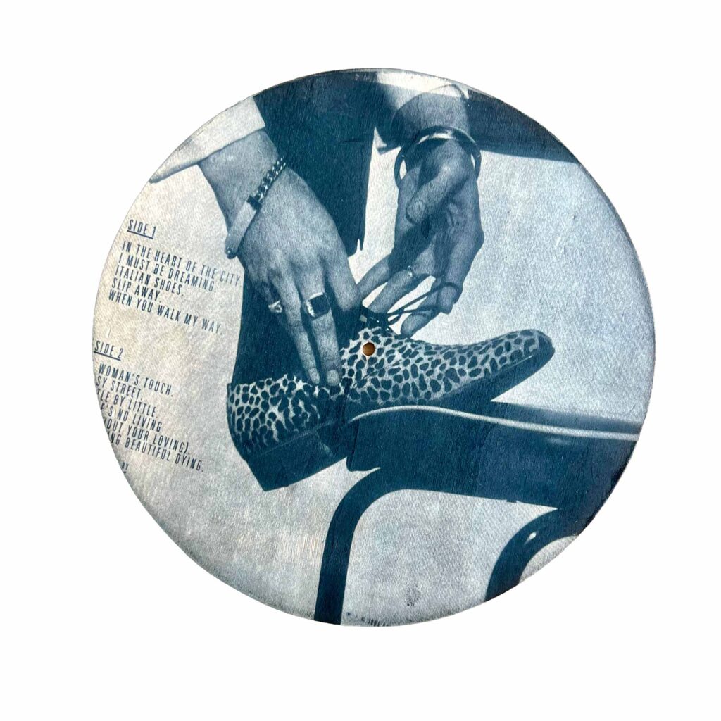 Verschiedene Plattenhüllen aus den 70er und 80er Jahren wurden mittels Siebdruck und schwarzer Druckfarbe auf Sperrholz in Plattengrösse gedruckt.